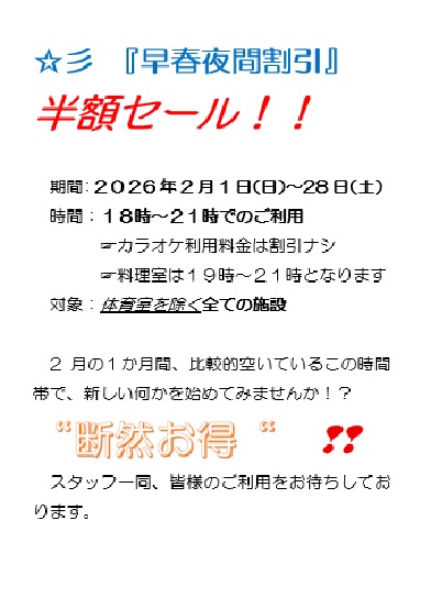 ☆彡早春夜間割引『半額セール』のお知らせ