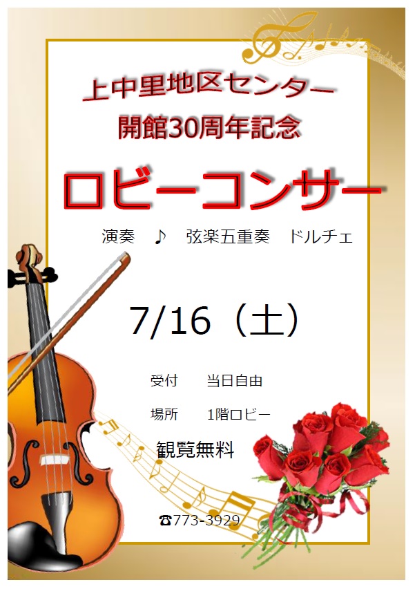 平成28年度は、30周年記念行事として年間6回『ロビーコンサート』の開催を予定しています。
