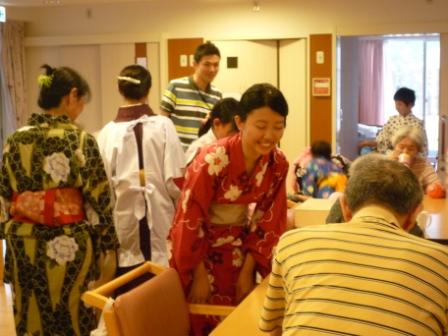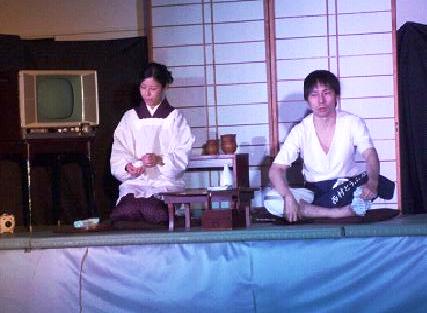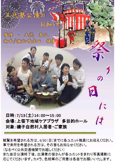 7月14日、俳優、五代高之さんの率いる演劇集団、「五代塾」のみなさんと一緒に、特別養護老人ホーム 磯子自然村様へ慰問公演に行ってきました。会場の、上笹下地域ケアプラザ 多目的ホールでは、90人以上のお客様が,あたたかく迎えてくださいました。演目は,『祭りの日には』という,昭和30年代の高度成長期を舞台にした公演です。豆腐屋のがんこおやじ、源さんをとりまく家族愛の物語ですが、時代背景を懐かしく感じた方も多かったようです。終了後に、出演者が部屋をまわって、お年寄りたちと交流を深めました。写真をとったり談笑したりして,楽しいひと時をすごしていただいたことを、とてもうれしく思います。明日もがんばるぞ!