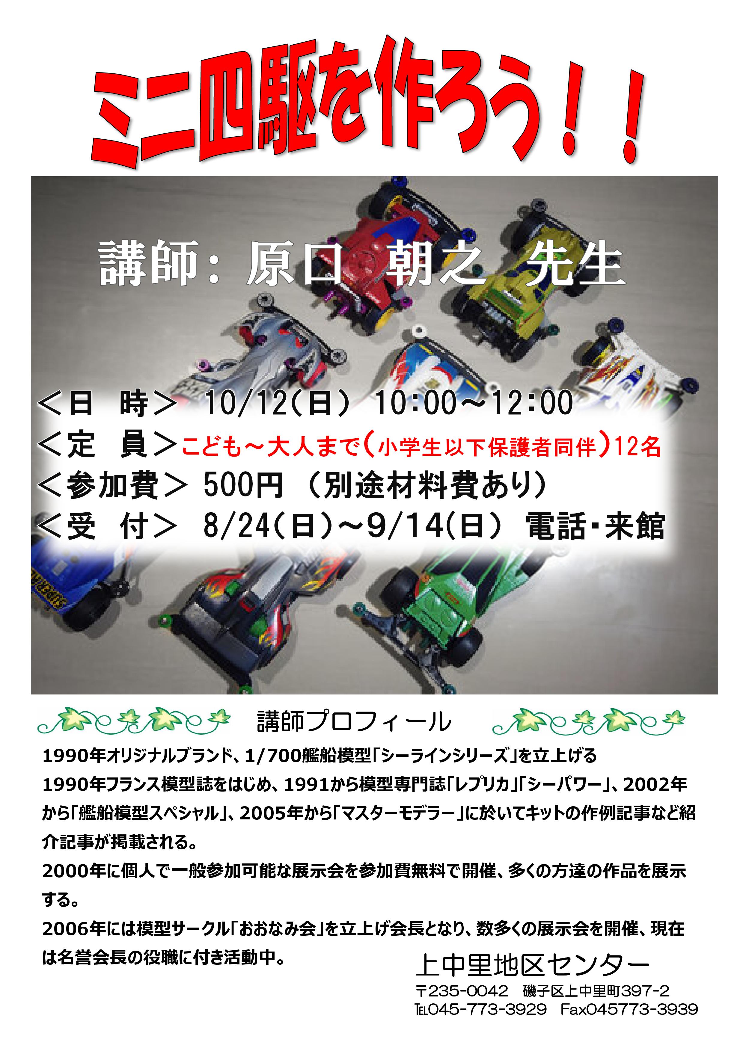 10/26の上中里地区センターフェスタで体育室にミニ四駆コースをご用意いたしますのでそこで走らせてみませんか!?
