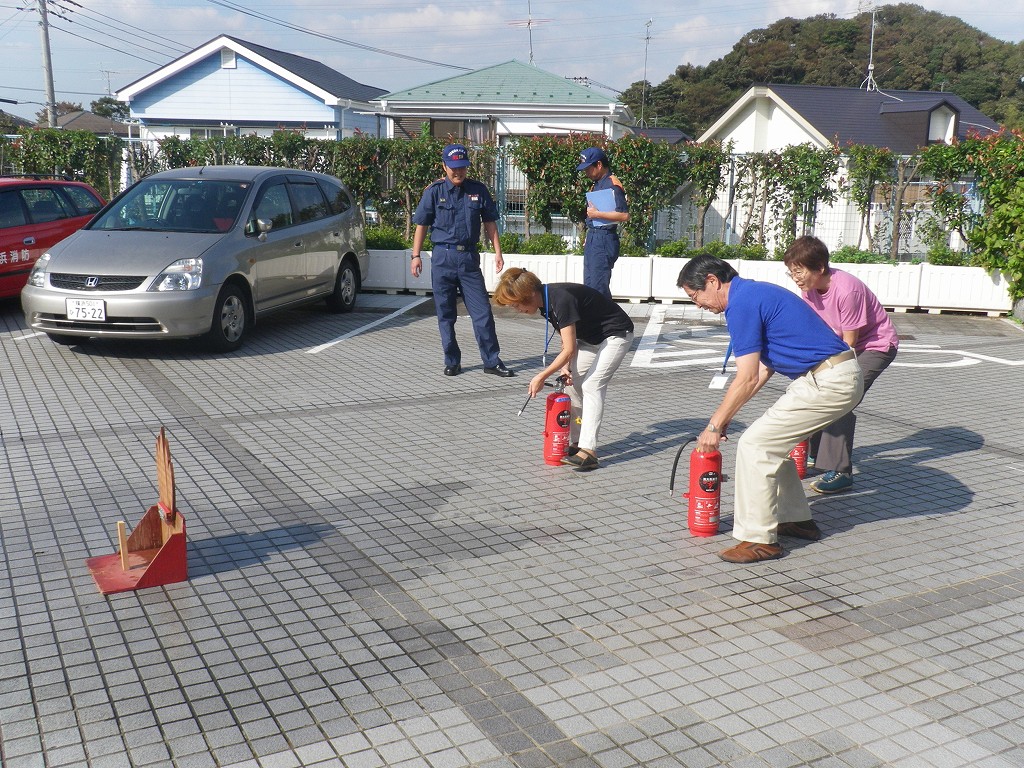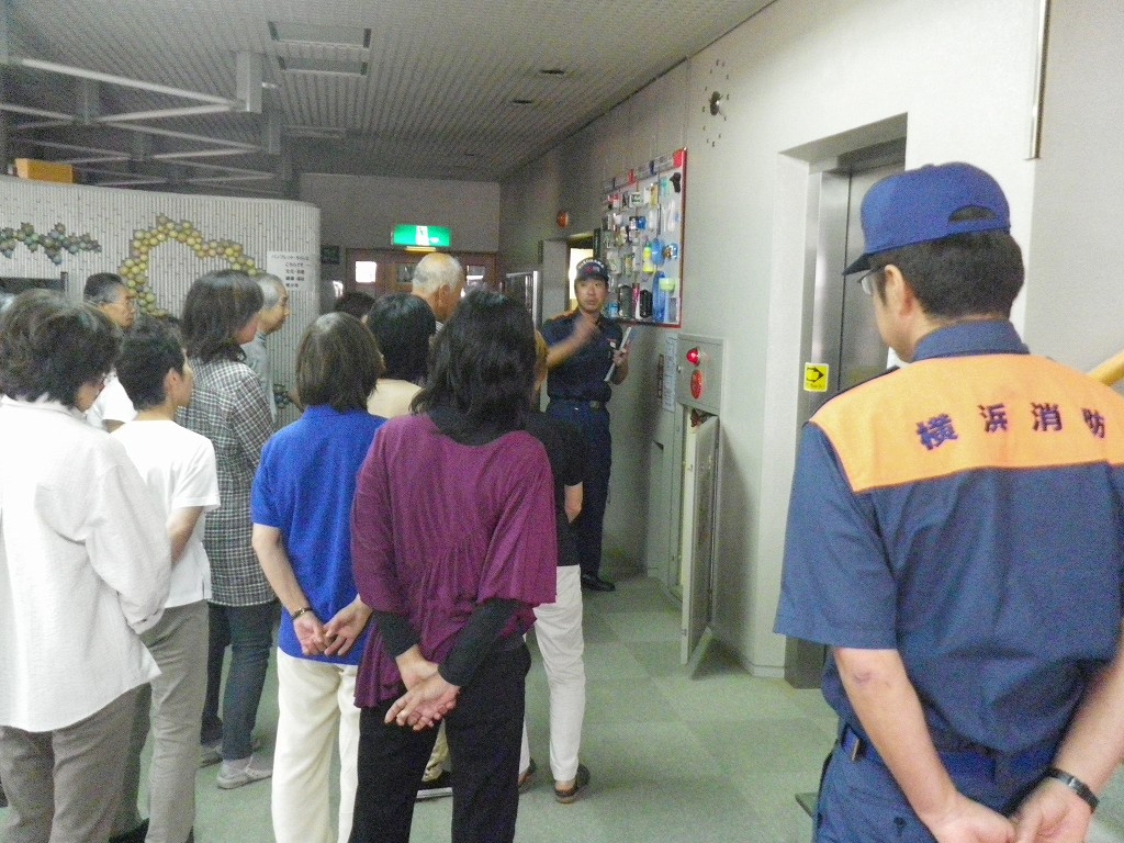 9月27日の休館日に防災訓練を実施しました。消火器、消火栓、非常口、避難経路、避難梯子の確認の後、磯子消防署の消防士長さんの指導のもとに、2階料理室から出火の想定で通報連絡班、避難誘導班、消火班の連携を訓練しました。最初はぎこちなかった動きも、回数を重ねるごとになめらかさを増し、大声を出すことと落ち着いて行動することができるようになりました。今後も訓練をかさねてゆきます。