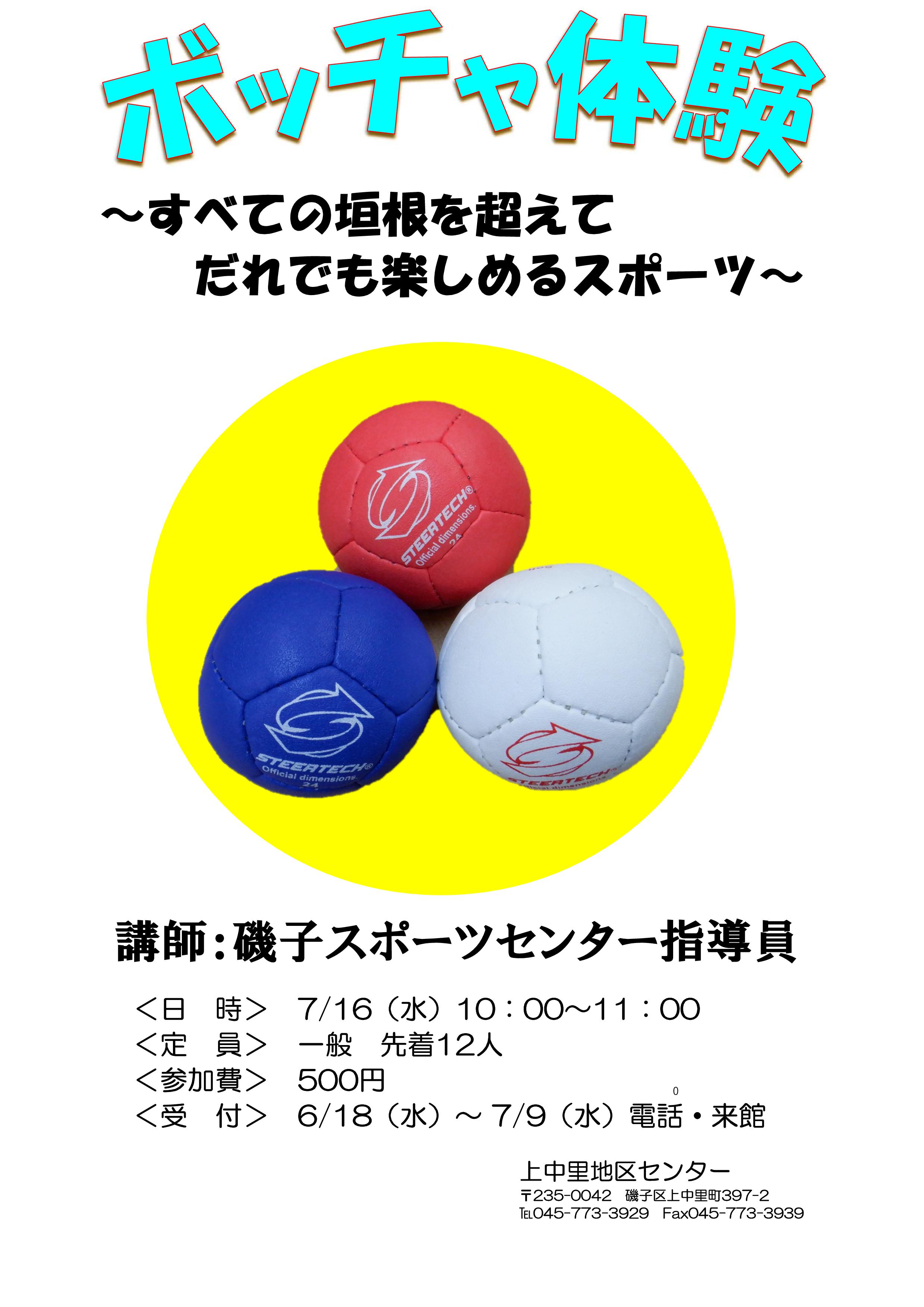 上中里地区センターでは、ご利用者さまよりのご要望にお応えして、「ボッチャ」のセットを購入いたしました。皆様に広くご活用いただけるよう、7月16日に磯子スポーツセンターより講師をお招きして「ボッチャ体験」の講座を開催いたします。皆様この機会にふるってご参加ください!!
