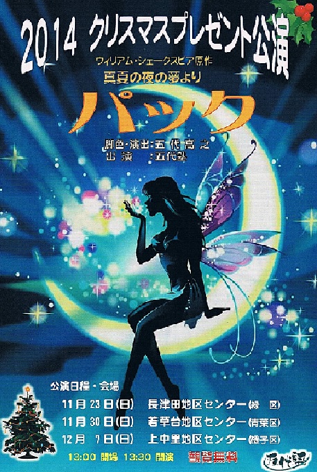 地域の皆さんに、演劇のクリスマスプレゼントができれば、と始まった企画も、ご好評をいただき4年目を迎えました。本年は、ウイリアム・シェークスピア原作『真夏の夜の夢』から、いたずら好きの妖精『パック』を主人公に、五代高之さんが脚色、演出を手がけて、皆様にお送りいたします。出演は五代塾のみなさんです。観覧は無料ですが、チケットが必要です。11月23日長津田地区センター、11月30日若草台地区センター、12月7日上中里地区センターで公演いたします。3館のうち、最寄の地区センターでご予約のうえお受け取りください。定員になり次第締め切らせていただきますので、お早めにどうぞ。